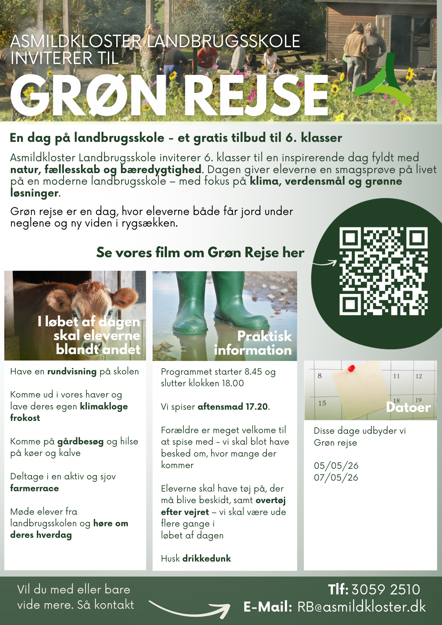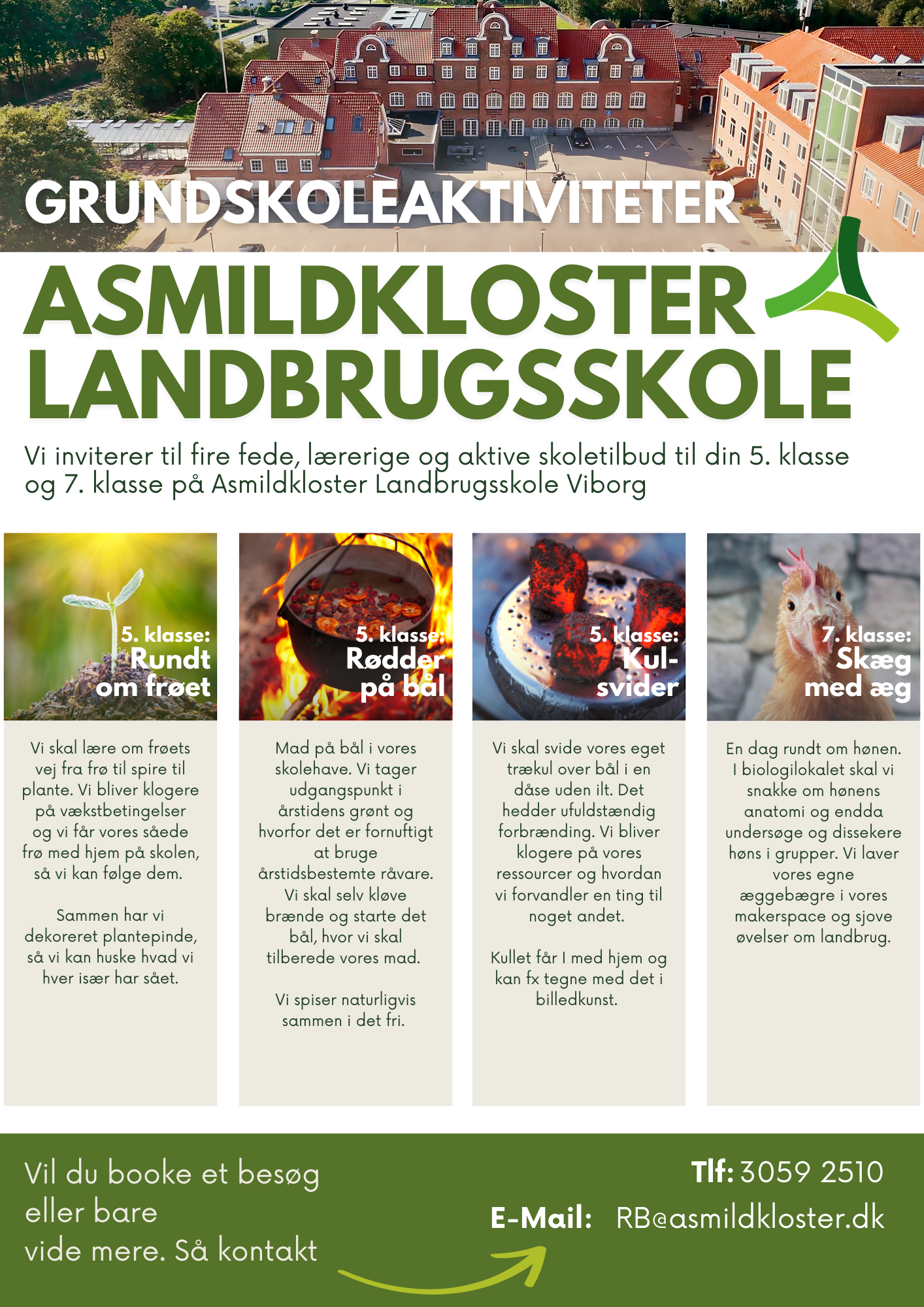 Asmildkloster Landbrugsskole er en moderne landbrugsskole i konstant udvikling. Vi arbejder på at være tæt på landbrugserhvervet og tæt på vores elever for at sikre det største udbytte for alle. Med vores placering ved søerne i Viborg er vi tæt på både by og land, og vores elever kan høste alle fordele ved den centrale placering. Skolen udbyder uddannelse til landbrugsassistent, landmand, EUX-landmand, afkortet forløb samt videregående uddannelse som produktionsleder og agrarøkonom.